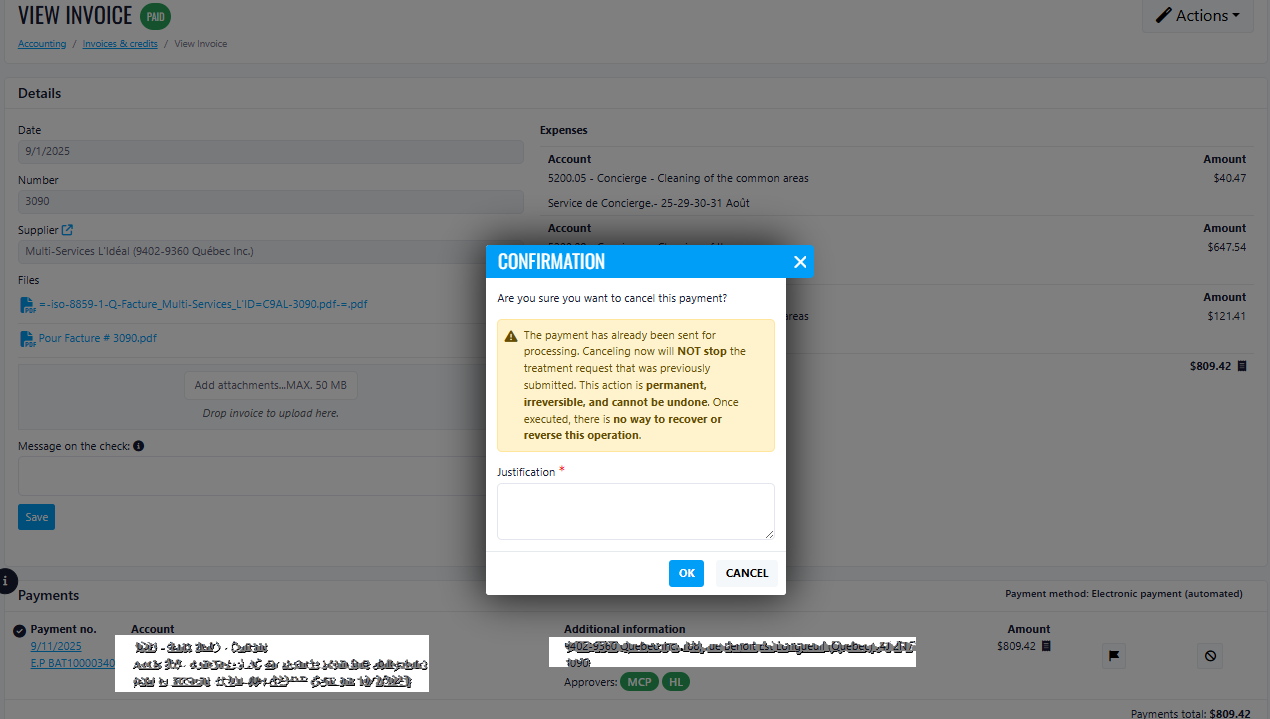 When canceling an invoice, users are prompted with a confirmation message and an optional text box to enter a reason. Providing a reason is not required to complete the cancellation.