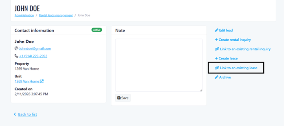 Link to Existing Lease: Connect a rental lead to an existing current or upcoming lease