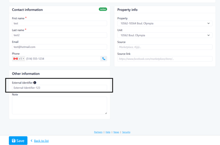 Usage: When creating or editing a rental lead, you can provide an External Id that will be stored with the lead and displayed in the contact information section. This identifier is essential for Zapier integrations as it allows triggers to send data related to specific leads back to your external systems.