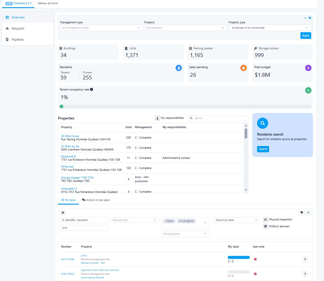 - Number of active buildings / units / parking / lockers (updates with property filter)