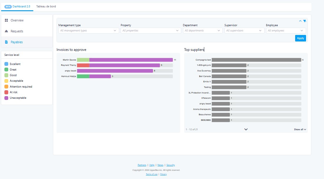 Highlighting invoices by how long they've been waiting for approval helps managers prevent late payment penalties and maintain healthy supplier relationships. The Top Suppliers tab adds context on which vendors generate the most invoice volume.