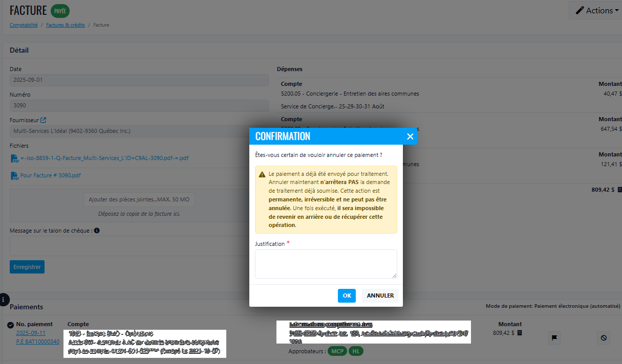 Lors de l’annulation d’une facture, un message de confirmation apparaît avec un champ de texte optionnel pour saisir une raison. Fournir une raison n’est pas obligatoire pour compléter l’annulation.