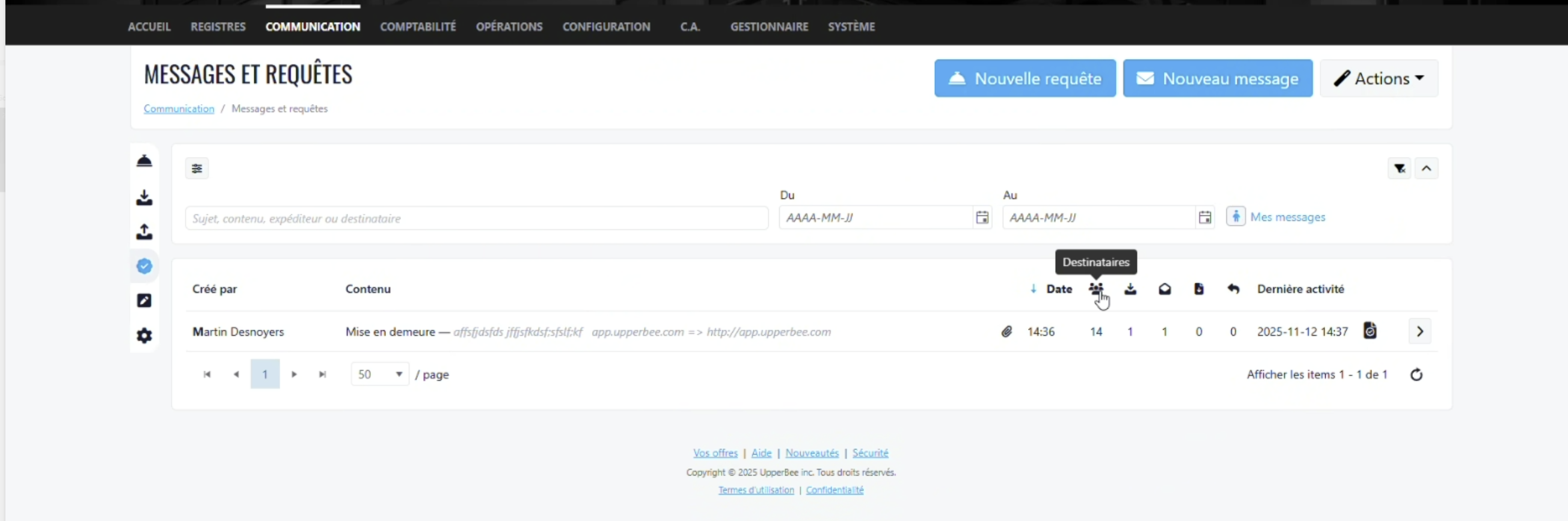 Tous les courriels certifiés sont maintenant regroupés au même endroit. Les utilisateurs peuvent filtrer, rechercher et consulter l’activité des courriels à travers les immeubles, unités, résidents et membres du personnel.
