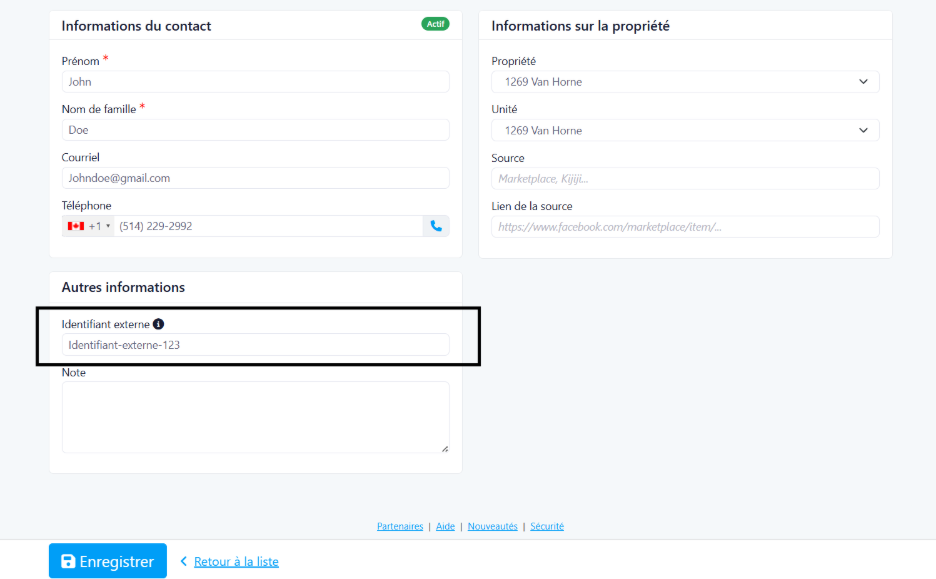 Utilisation : Lors de la création ou de la modification d'un candidat locataire, vous pouvez fournir un identifiant externe qui sera stocké avec le candidat et affiché dans la section des informations de contact. Cet identifiant est essentiel pour les intégrations Zapier car il permet aux déclencheurs d'envoyer des données liées à des candidats spécifiques vers vos systèmes externes. L’identifiant externe peut être ajouté en créant un candidat locataire ou peut être modifié lorsqu’on en édite un. Lorsqu’il y a identifiant externe il sera affiché dans la page détail a l’intérieur de la carte Informations du contact.