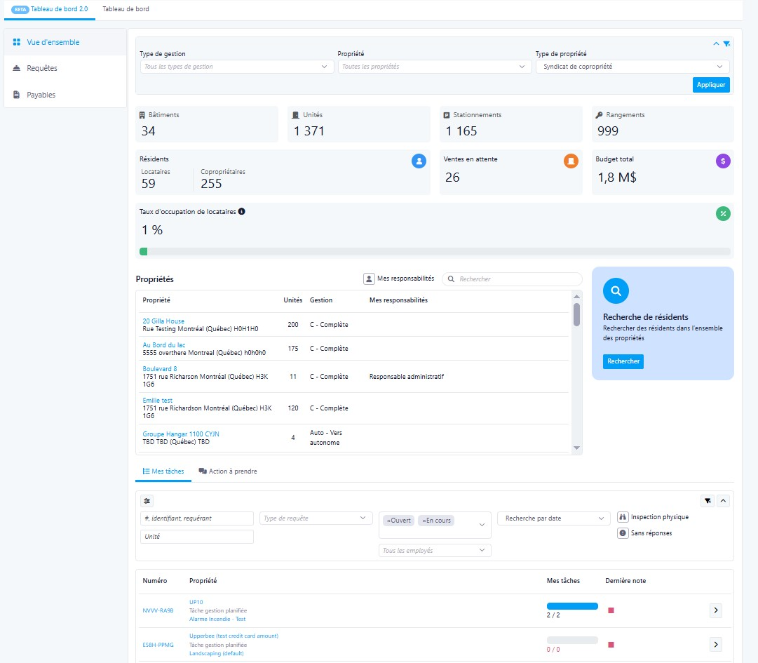 - Tableau des propriétés :Nom de la propriété, nombre d'unités, type, mes responsabilités. Filtrable par le bouton bascule « Mes responsabilités »