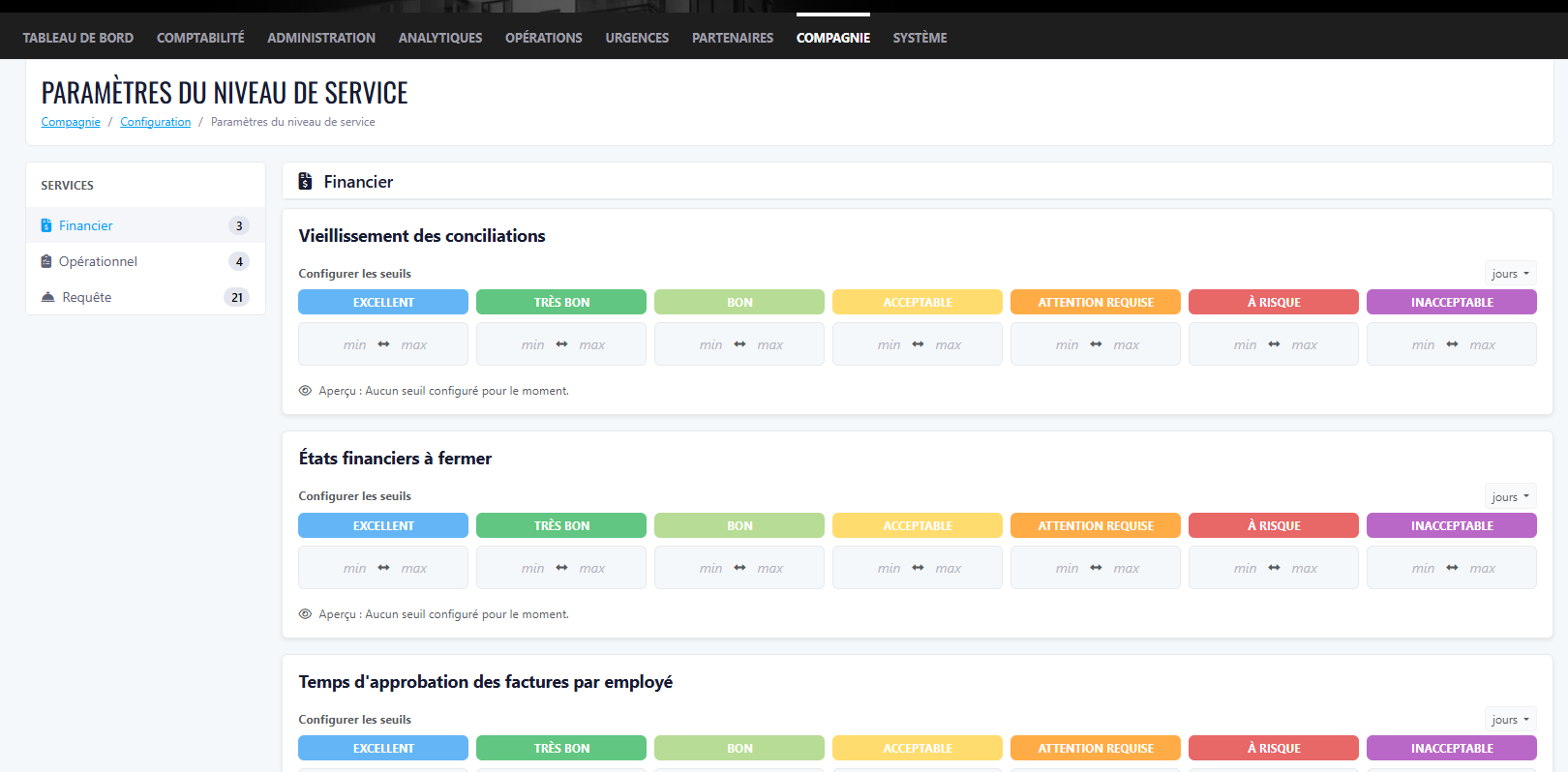 Les Paramètres de Niveau de Service permettent à l'entreprise de configurer des seuils de performance pour les métriques clés du tableau de bord.